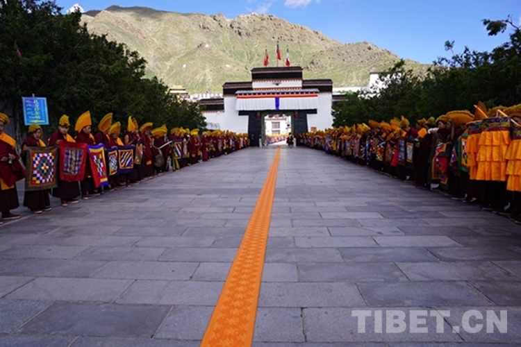 當(dāng)天,扎什倫布寺裝扮一新,寶頂流彩,金碧輝煌,寺院大門前信眾摩肩接踵翹首以盼,通往寺廟大殿的道路兩側(cè)僧眾比肩而立列隊歡迎,整個寺院沉浸在祥和、莊重、熱烈的氣氛中。