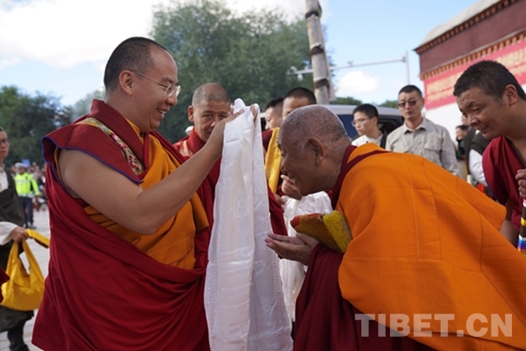 圖為扎什倫布寺高僧代表向班禪敬獻(xiàn)哈達(dá) 攝影:王淑