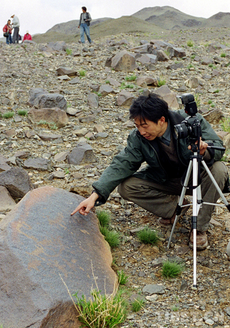 藏北高原無人區(qū)科考團(tuán)人員在對(duì)尼瑪縣榮瑪鄉(xiāng)加林山巖畫進(jìn)行科考(唐召明2001年攝)