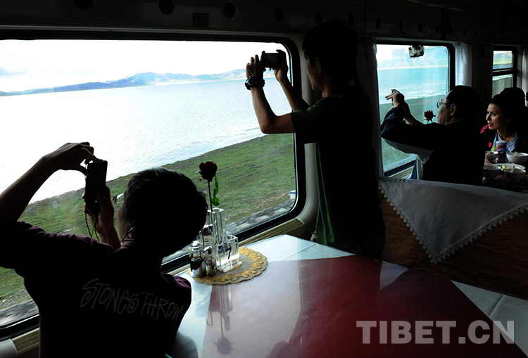 “天路”列車在通過錯(cuò)那湖時(shí),旅客們紛紛用手機(jī)拍攝美景(唐召明2012年8月12日攝)