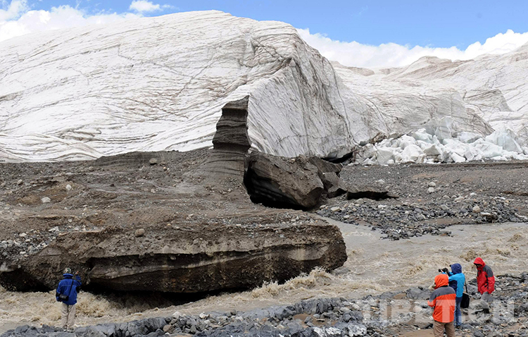 在雙湖縣境內(nèi)的普若崗日冰川,游客們?cè)谂恼沼斡[(唐召明2009年8月1日攝)