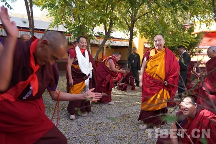 圖為班禪在扎西吉培寺辯經(jīng)場(chǎng)觀摩僧人辯經(jīng) 攝影:王淑