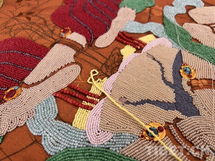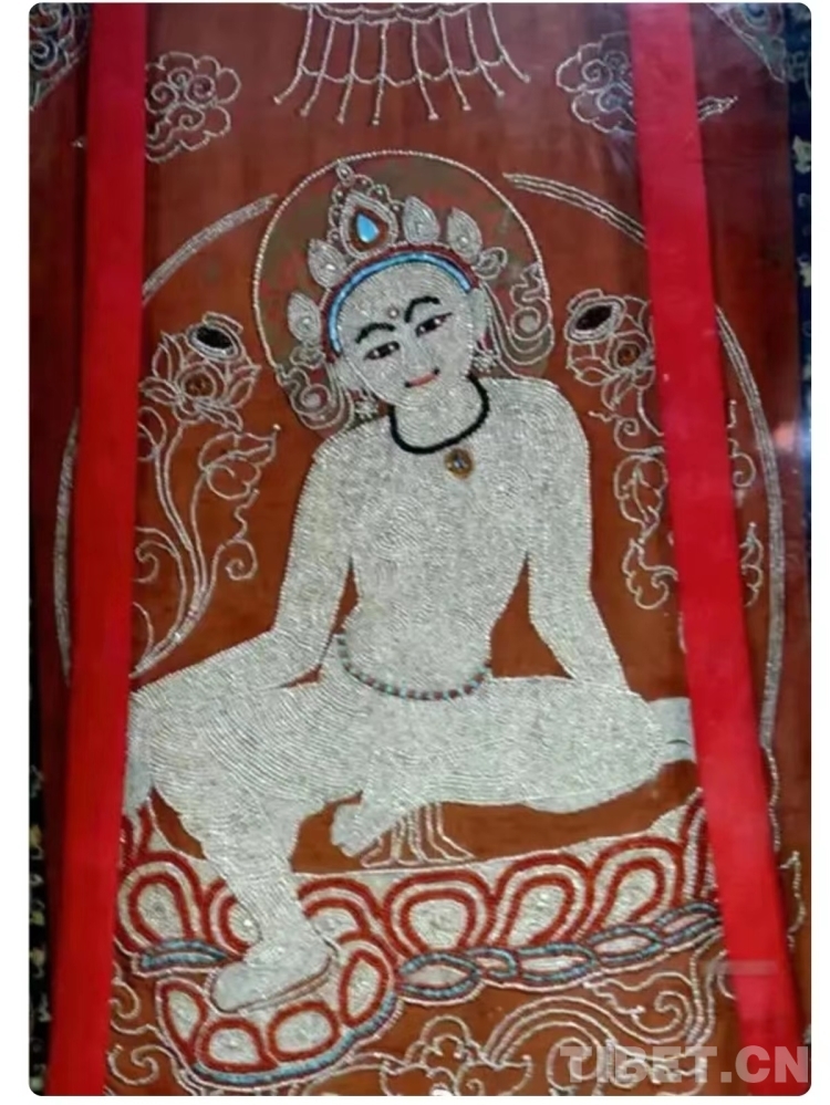 掌握了藏繡技藝,夫妻二人有了新的發(fā)展目標(biāo)。在傳承和發(fā)展傳統(tǒng)堆繡技藝的同時(shí),土旦想要?jiǎng)?chuàng)新更有特色的藏繡作品,于是創(chuàng)作“珍珠唐卡”的想法在他腦海中萌生。“之所以想要?jiǎng)?chuàng)作珍珠唐卡,是因?yàn)橛写挝以谏侥系牟樗驴吹搅恕^世音菩薩憩息圖’這幅珍珠唐卡,我被它精美絕倫的制作工藝深深吸引,心想自己從事堆繡創(chuàng)作多年,也應(yīng)該去嘗試制作‘珠繡’作品了?!蓖恋┫蛴浾咧v述了他與珍珠唐卡的“結(jié)緣”經(jīng)歷。