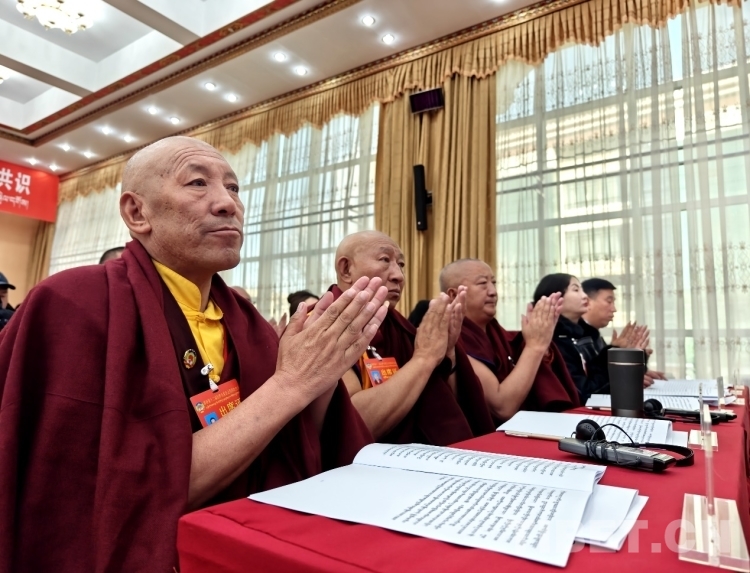 圖為政協(xié)委員認真審閱藏文版會議資料 攝影:次旦拉姆