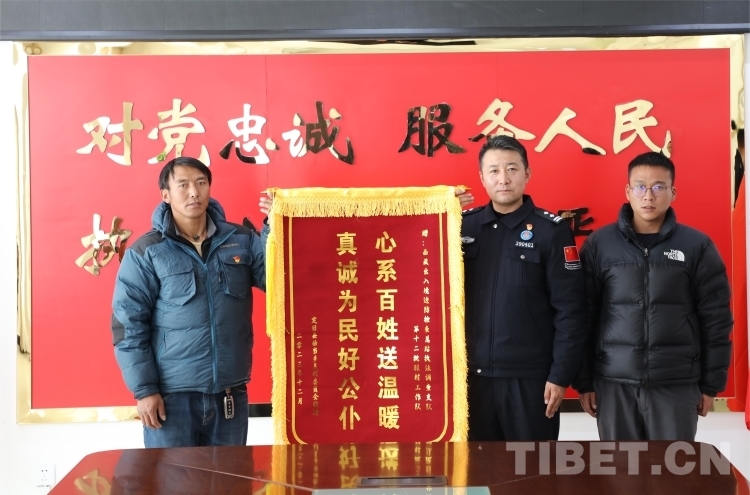 圖為曲當(dāng)鄉(xiāng)差村支部書記向西藏邊檢總站執(zhí)法調(diào)查支隊駐村民警送錦旗 高昱攝