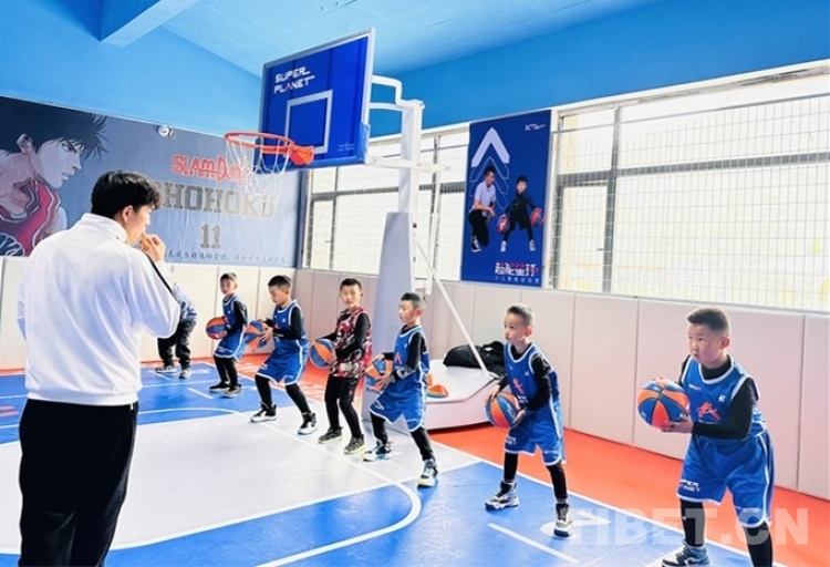 圖為籃球培訓(xùn)課上,身穿籃球服的小朋友在認(rèn)真聽(tīng)課