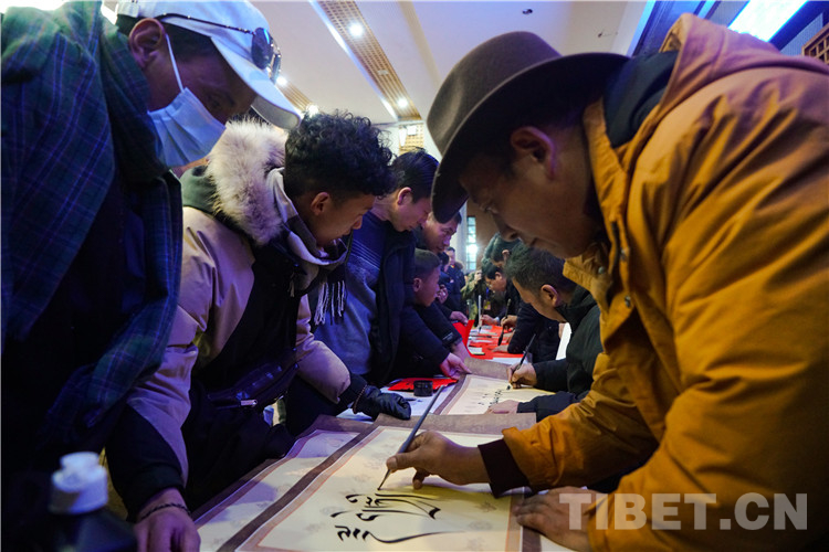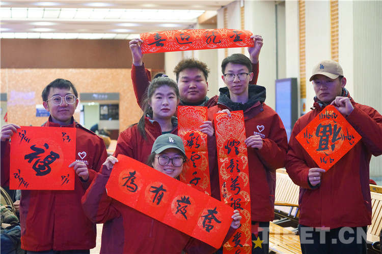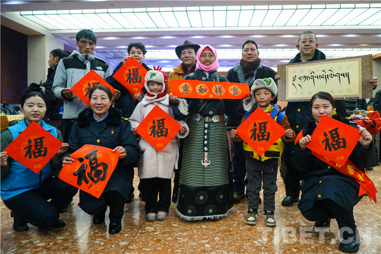 圖為春運(yùn)首日拉薩站向旅客免費(fèi)贈(zèng)送漢藏春聯(lián)及書法作品 攝影:趙振宇