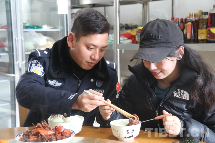 氧氣瓶、高原藥品、熱水......接德吉永措的車上已準備好了各種抗高反和取暖的東西,這讓她提前感受到了來自丈夫單位的熱情與關懷。與愛人相聚后,旦增洛追帶著妻子參觀營區(qū),迫切地想讓她了解他用青春為之奮斗的警營,隨后他又帶著妻子到單位食堂品嘗自己親自下廚做的紅燒肉?!班牛∥兜篮芎?。”德吉永措吃著丈夫給她夾的肉,臉上洋溢著幸福的笑容。