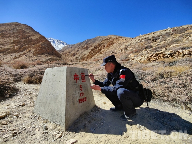 巡邏結(jié)束回到執(zhí)勤點(diǎn)后,邊巴次仁并沒有卸下執(zhí)勤裝備,而是拿著毛筆和紅油漆朝著執(zhí)勤點(diǎn)的河對(duì)岸走去,過河幾百米便是中尼5號(hào)界樁?!爸挥袌?jiān)守在邊境的我們才能體驗(yàn)到,除夕這天,為界碑描紅的自豪感?!彼贸雒P跟紅漆一筆一劃地描著界碑上的每一個(gè)字。“描紅界碑那一刻,眼前是界碑,身后是祖國(guó),我們守的是萬家燈火。”邊巴次仁眼神堅(jiān)定地看著身前的界碑說。