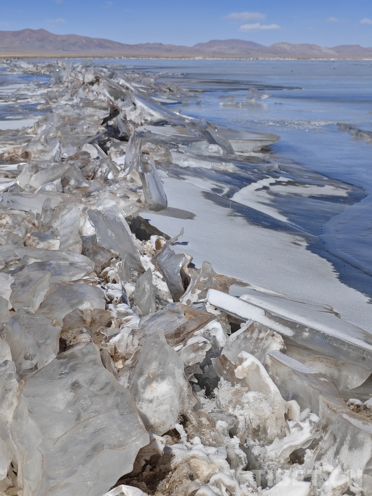錯(cuò)那湖湖面海拔4600米左右,面積400多平方公里,是世界上海拔最高的淡水湖,更有冰泡、冰裂、冰推等奇妙的自然景觀。當(dāng)氣溫急劇下降時(shí),水溫也驟降,湖底產(chǎn)生的氣體在上升過(guò)程中被凍在冰中,形成許多細(xì)小的白色氣泡,懸浮在厚厚的冰層之中。湖水表面一層被藏北的朔風(fēng)快速凍結(jié)成冰,部分碎冰在岸邊堆積,形成隆起的“冰岸線”。又由于初春晝夜溫差較大,湖冰崩裂,形成網(wǎng)狀的冰裂紋路。這些透明裂紋從岸邊開(kāi)始,像潮水一樣漫過(guò)平地,漫過(guò)羌塘草原腹地,漫到天邊,把羌塘大地裝扮成一個(gè)冰晶縱橫交錯(cuò)的世界。(中國(guó)西藏網(wǎng) 文/李一凡 張萌萌 龍真多吉)