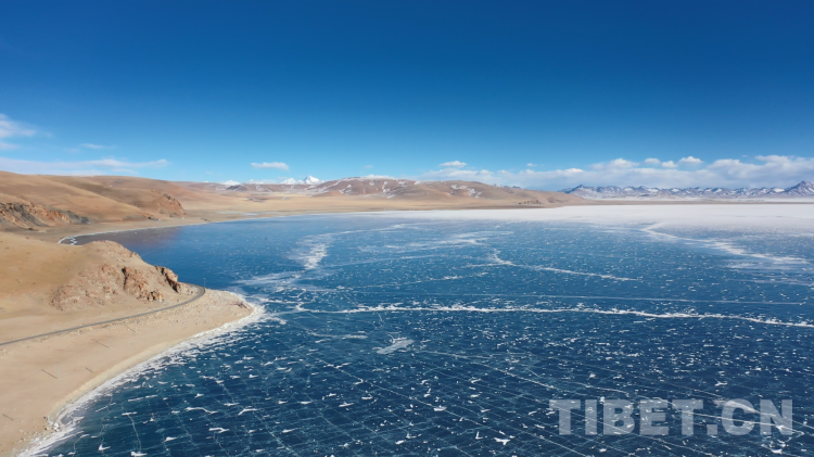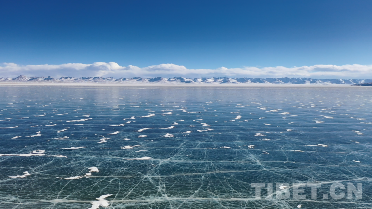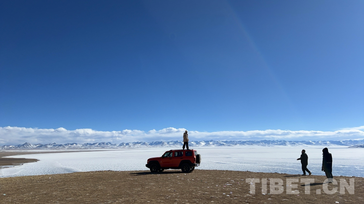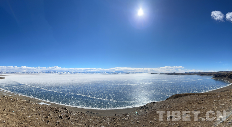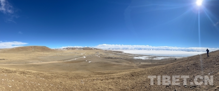 爬上一座山丘,視野陡然明亮開闊起來。原本土黃色的藏北天然牧場(chǎng)高低起伏,黑牦牛零星地散落在山坡,登上高處后,天際圣境納木錯(cuò)便映入眼簾。初春時(shí)節(jié)的拉薩依然春寒料峭,納木錯(cuò)的落雪還未完全消融,站在高處俯視,這片安靜的大湖被陽(yáng)光反射得白茫茫一片。更幸運(yùn)的是碰到了晴好的天氣,白云與湖冰相襯,亦與遠(yuǎn)山相接,視線盡頭的念青唐古拉山脈直視無礙,畫面猶如“半池白云半池玉”般頗具美感。