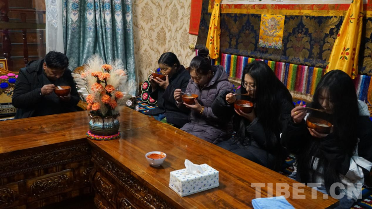 下午時分,“古突”夜的準備就開始了,先是將羊肉放入鍋中燉煮,再是將白蘿卜切片備好,隨后與奶奶、兩個女兒及丈夫,一家人圍坐在溫暖的廚房說說笑笑地捏“古突”里的面疙瘩,做面疙瘩時,要準備一些稍大的特殊面疙瘩,分別包進寫有石子、辣椒、羊毛、木炭等字樣的紙條,代表“心腸硬”“刀子嘴”“心腸軟”“黑心腸”等含義,待到吃“古突”環(huán)節(jié),來一場藏式風格的“開盲盒”,據(jù)說每個人吃到的字樣能在某種程度上代表新一年的運勢或性格。