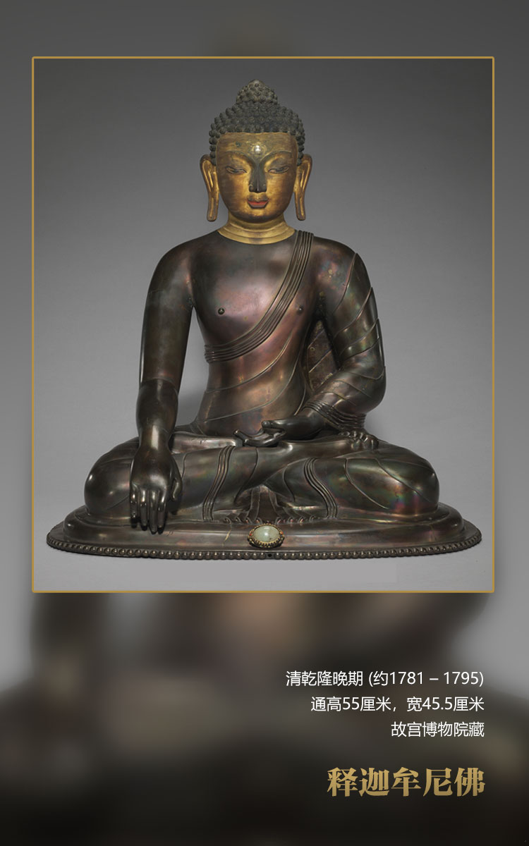 此尊釋迦牟尼佛寶相莊嚴,螺發(fā)肉髻,眉間白毫嵌碩大的東珠,雙眉上揚,眼睛垂視,微微含笑,面龐俊朗,表現(xiàn)了其青年形象。面部及頸部泥金,身體挺拔,肩膀寬闊;著袒右式袈裟,袈裟貼體,樣式簡潔。右手施觸地印,左手結禪定印,全跏趺坐于座墊上,底座缺失。