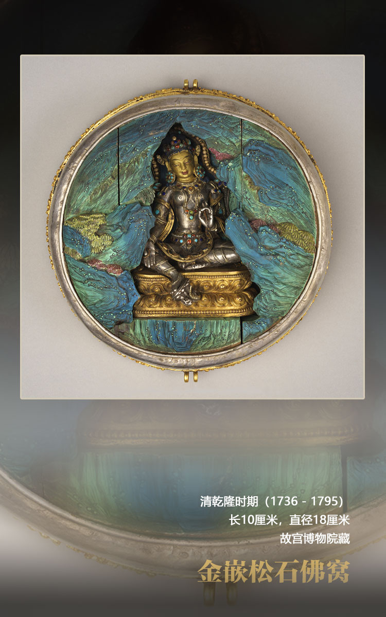 此佛窩九成金質,圓盒狀,金質盒蓋上滿嵌梯形同心圓狀綠松石片,側面有三條松石鑲嵌的裝飾帶及蓮花紋圖案。盒蓋兩邊有可拆卸雙耳,可穿繩佩戴頸上,為護身佛盒。盒內填染青綠木雕山洞,中間供有銀質綠度母一尊。度母面部泥金,右手與愿印,左手說法印,身上嵌綠松石、青金石、蜜蠟等,游戲坐于飾連珠紋和俯仰蓮瓣紋的金座上。附黃紙簽一張,上書漢、滿、蒙、藏四體文題記,漢文曰:“乾隆四十五年八月初七日,班禪額爾德尼恭?;噬掀哐f壽,遞丹書,呈進大利益綠衣救度佛母古佛?!?此處“大利益”有大功德之意,根據(jù)銘文可知,這個佛窩應是乾隆帝七十大壽時六世班禪敬獻的祝壽禮物。(文圖資料來源:澳門藝術博物館 中國西藏網(wǎng) 記者/易文文 趙佳 呂靜 王東 姚浩然)