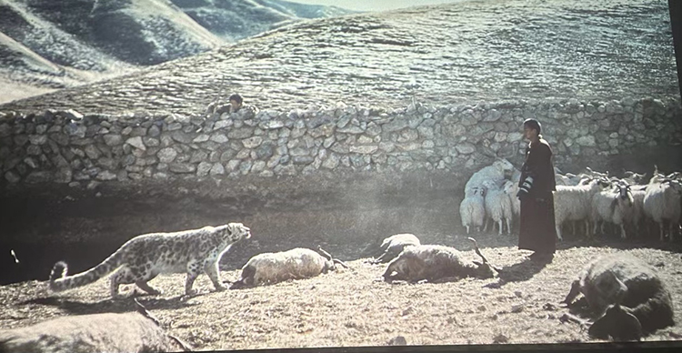 影片的結(jié)尾似乎很突然,雪豹終究沒有死在受損牧人暴怒的情緒和揮舞的錘子下,在人類文明的關(guān)照下,被主動(dòng)解圍,回歸雪山,與小雪豹相會(huì)相伴。只有萬導(dǎo)這種深邃包容、沉著冷靜又充滿睿智的作家、藝術(shù)家才能挖掘和表現(xiàn),這里蘊(yùn)含著生命的慈悲和世人的智慧。對此,我們還有哪些拷問呢?