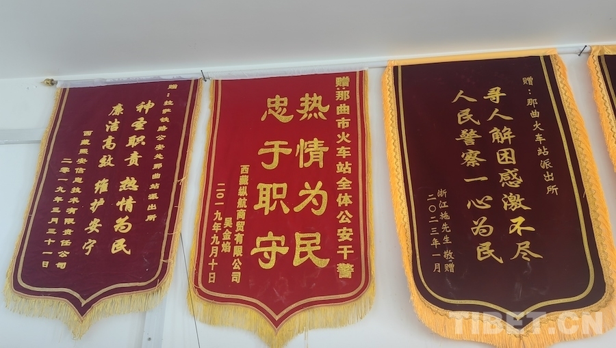 圖為那曲站派出所墻上懸掛的錦旗(部分) 攝影:張萌萌
