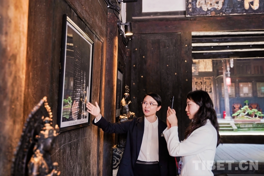 姜氏古茶第十五代傳承人萬姜紅(左)在中國(guó)西藏網(wǎng)視頻號(hào)直播時(shí)向廣大網(wǎng)友介紹姜家大院歷史和有關(guān)老照片的故事 楊洋供圖
