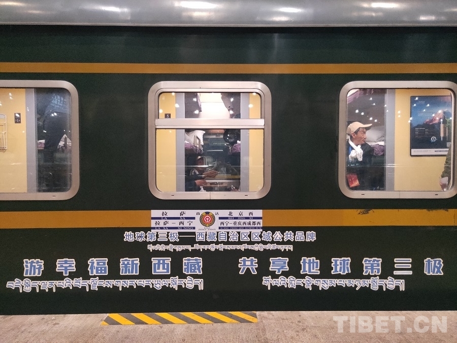 圖為考察學(xué)習團成員乘坐的張貼“地球第三極”標識的鐵路Z21次列車 攝影:周晴晴