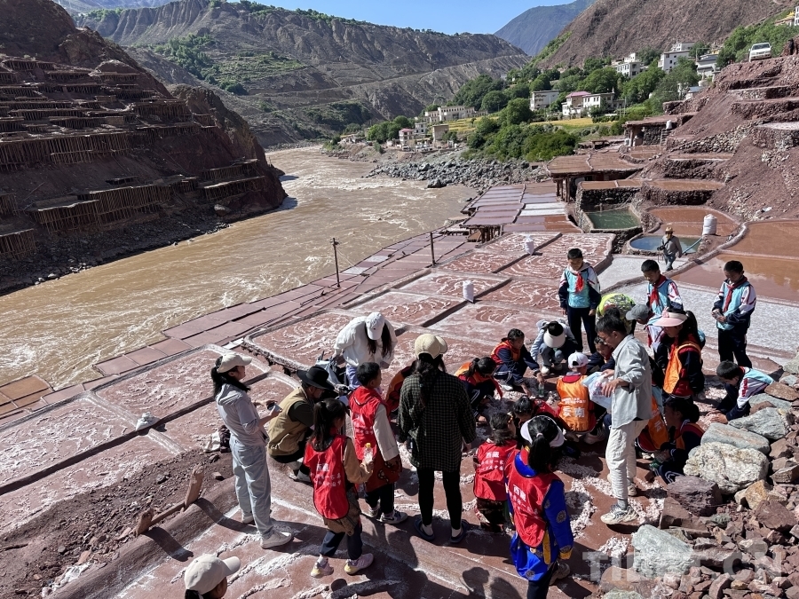 圖為學(xué)生們?cè)诠披}田體驗(yàn)和感受古老的制鹽文化