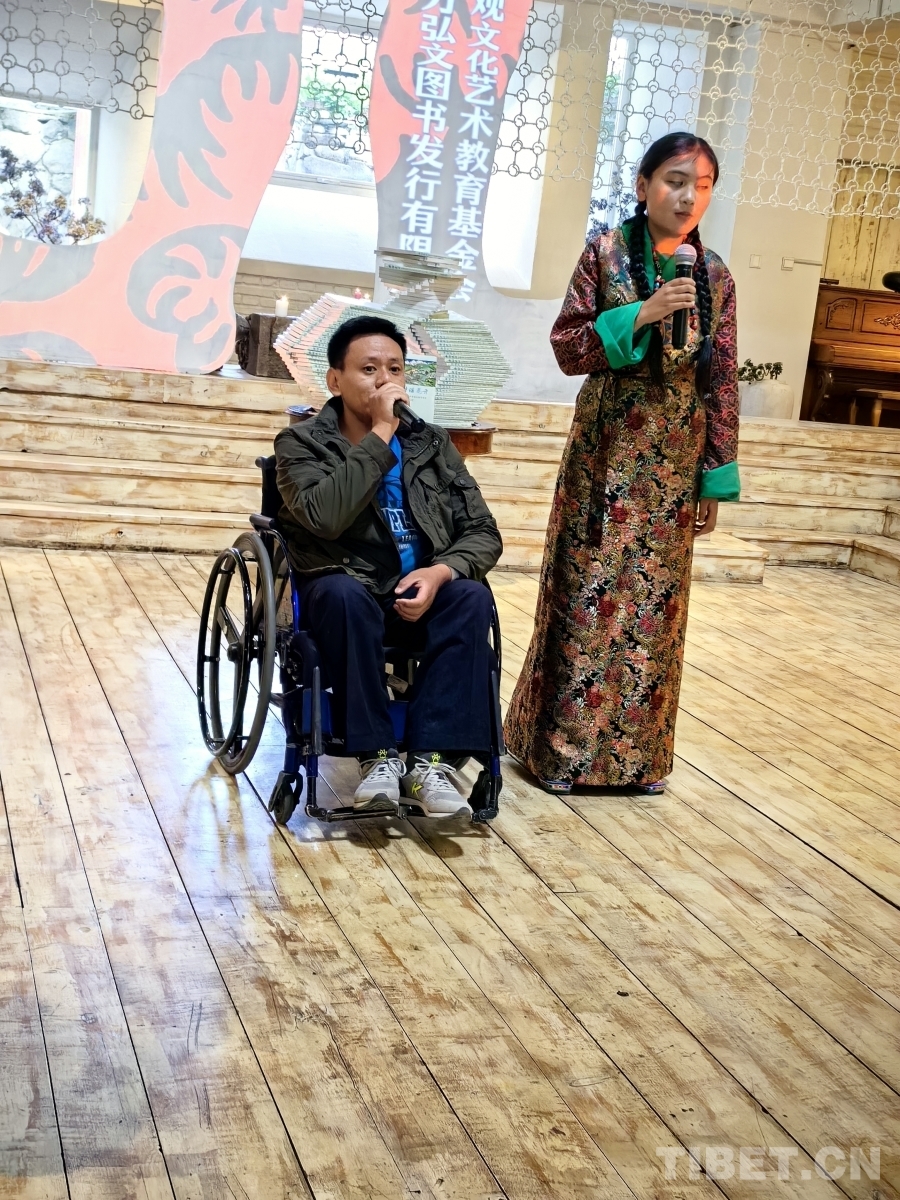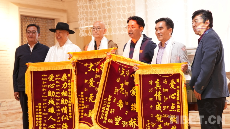 活動(dòng)現(xiàn)場(chǎng),拉薩市特殊教育學(xué)校師生向西藏社會(huì)主義學(xué)院羅旦博士、中國(guó)藏學(xué)出版社代表、北京大方弘文圖書發(fā)行有限公司代表、西藏介觀文化藝術(shù)教育基金會(huì)代表敬獻(xiàn)了哈達(dá),贈(zèng)送了錦旗、畫作,對(duì)他們?cè)谛聲霭嬷薪o予的支持和幫助表達(dá)了誠(chéng)摯的謝意。隨后,拉薩市特殊教育學(xué)校學(xué)生為現(xiàn)場(chǎng)來(lái)賓表演了二重唱《愛在陽(yáng)光下》、詩(shī)歌朗誦《光明》、舞蹈《舞動(dòng)大地》等精彩的節(jié)目,將活動(dòng)推向高潮,現(xiàn)場(chǎng)觀眾紛紛鼓掌叫好,氣氛十分感人。