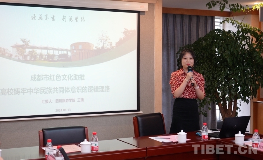四川旅游學院四川省鑄牢中華民族共同體意識基地辦公室主任王瑞介紹了成都市豐富的紅色文化資源,從內在關聯(lián)和實踐路徑兩個層面探討了紅色文化與中華民族共同體意識的契合度,以及助推高校鑄牢中華民族共同體意識的方式方法。