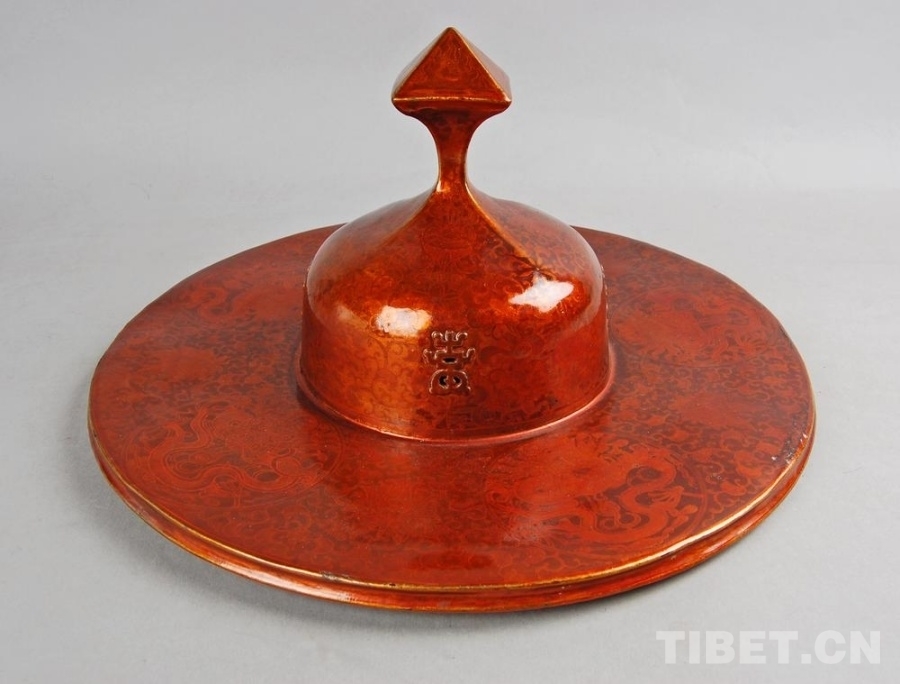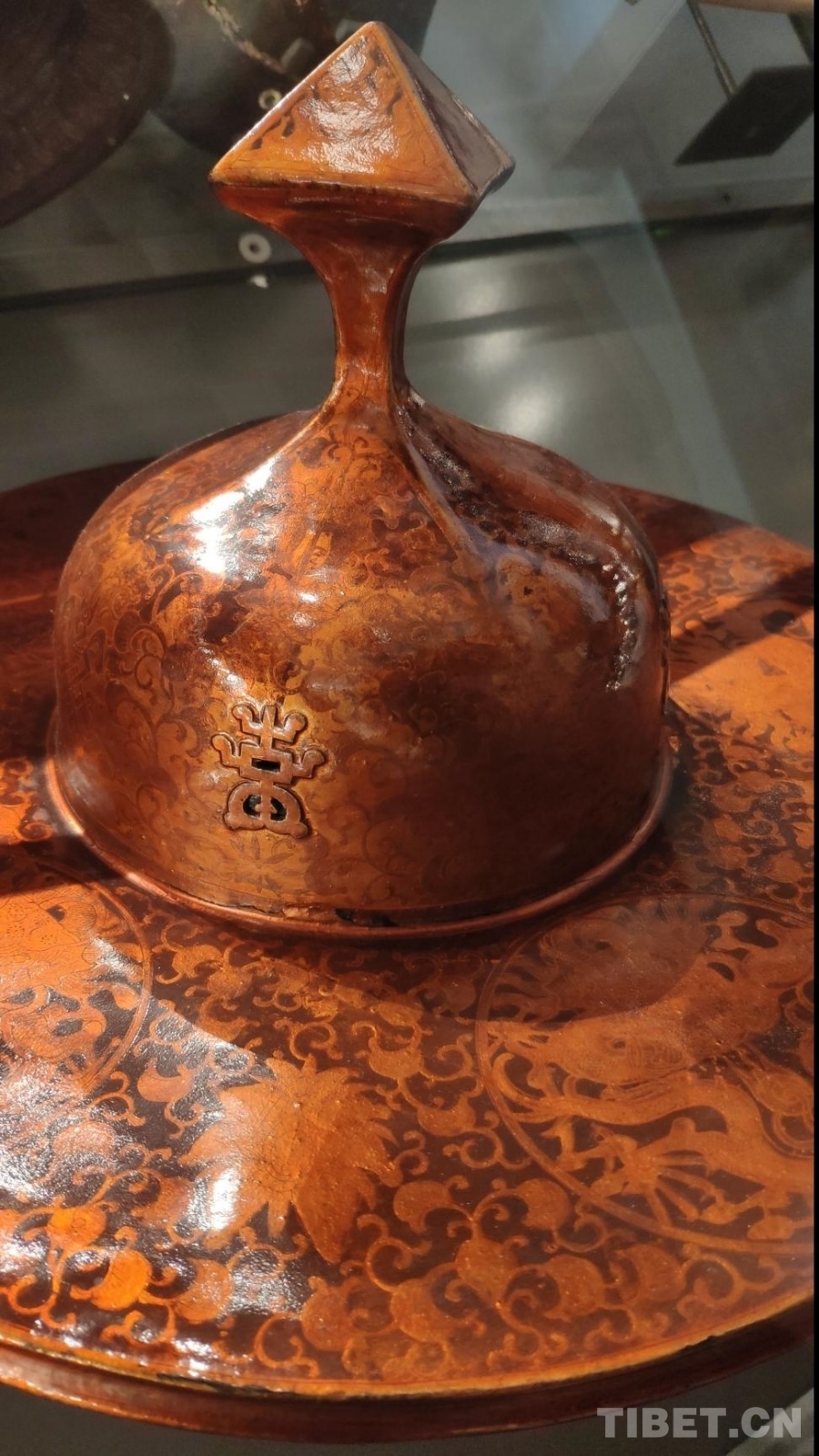 14號(hào)藏品為僧官帽,出自西藏,進(jìn)入館藏時(shí)間為1905年。據(jù)博物館介紹,這頂漆帽原屬于寺院一位僧官所穿服飾的一部分。過去,西藏地方政府實(shí)行“政教合一制度”,寺院作為一個(gè)地方的宗教事務(wù)和寺院自身的管理者和統(tǒng)治者,同時(shí)又是這個(gè)地方社會(huì)的主要管理者和統(tǒng)治者。因此,遍布西藏各地的寺院往往都是當(dāng)?shù)氐恼巍⒔?jīng)濟(jì)、文化中心,具備政治、經(jīng)濟(jì)、教育、司法等職能。寺院內(nèi)部設(shè)立不同級(jí)別或不同分管領(lǐng)域的僧官來(lái)共同管理整個(gè)寺院的內(nèi)外政教事務(wù)。