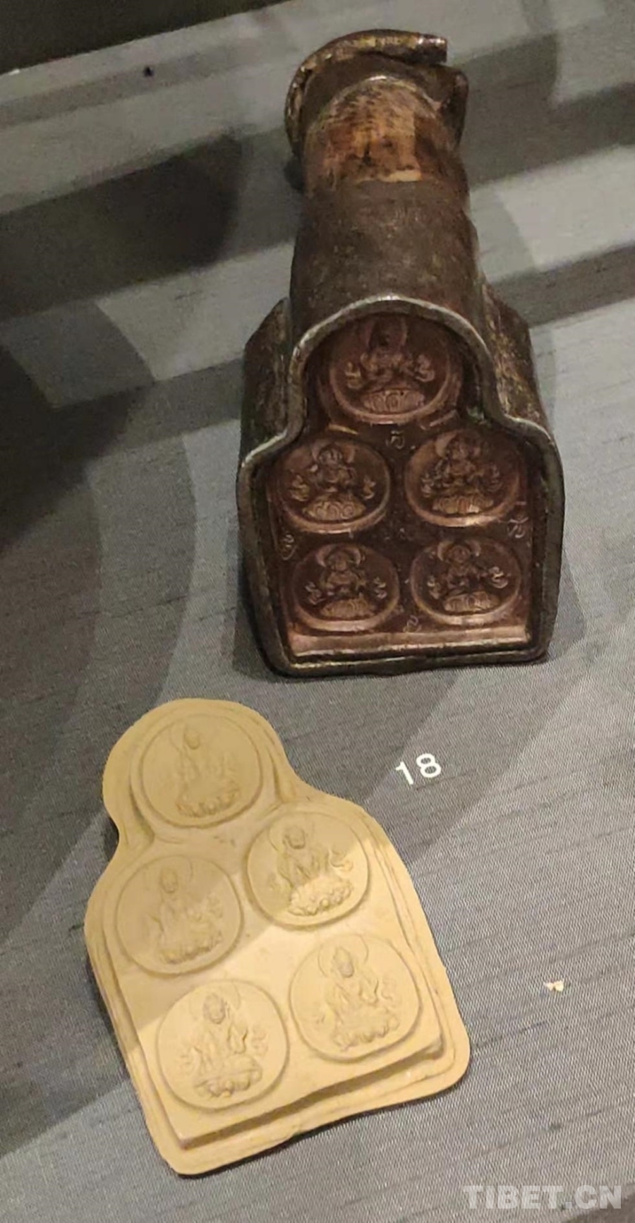 “擦擦”模具,出自西藏,模具為鐵質(zhì),手柄為木質(zhì),一模五腔,進(jìn)入館藏時(shí)間為1905年。“擦擦”音譯自梵語(yǔ),意思是“復(fù)制”,指一種模制的泥佛或泥塔。藏傳佛教認(rèn)為,制作“擦擦”可積攢善業(yè)功德,并將其視為消災(zāi)祈福的圣物?!安敛痢北黄毡楣┓钣谏裆?、神殿、寺廟旁,大路中央或交叉路口。還有的“擦擦”存放于大佛像的體內(nèi)、佛塔中央。除以上的供奉方式外,“擦擦”還常被安放于隨身佩帶的“嘎烏”之內(nèi),充當(dāng)護(hù)身符。