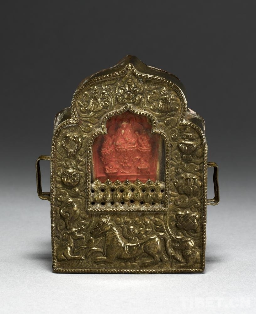 19號(hào)藏品為銅制“嘎烏”,內(nèi)裝有“擦擦”和香料包,出自西藏,進(jìn)入館藏時(shí)間為1905年。“嘎烏”,是藏語(yǔ)的音譯,指護(hù)身佛的盒子,即小型佛龕。盒子里一般裝有“擦擦”佛像、印著經(jīng)文的綢片、舍利子或者甘露丸、由高僧念過經(jīng)的藥丸,以及活佛的頭發(fā)、衣服的碎片等?!案聻酢边€是精美的裝飾品。其形狀不一,一般為銀質(zhì)或銅質(zhì),盒面上鑲嵌有瑪瑙、綠松石,雕刻有多種花紋圖案。