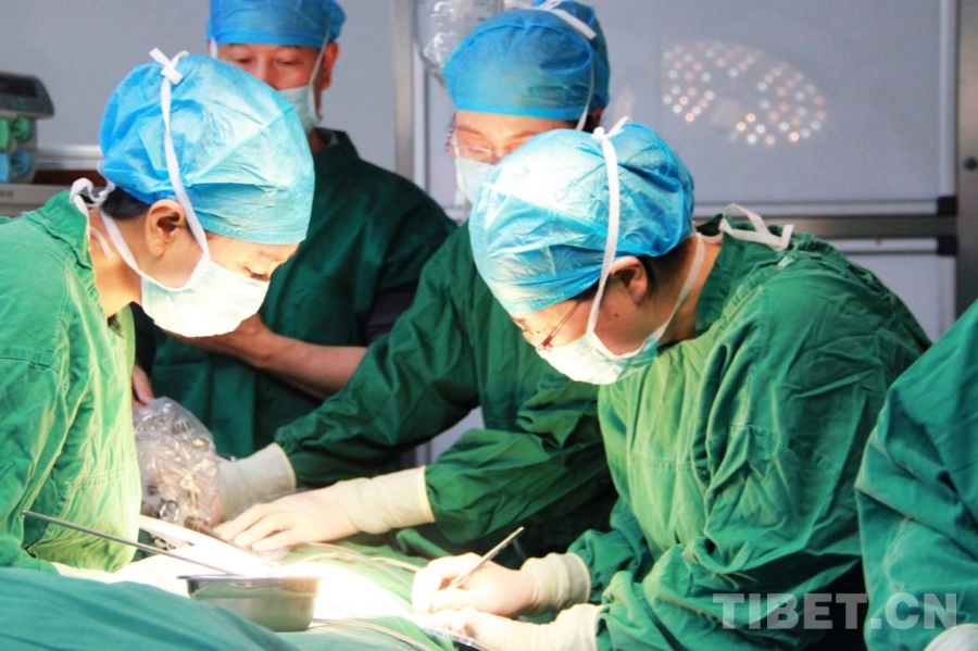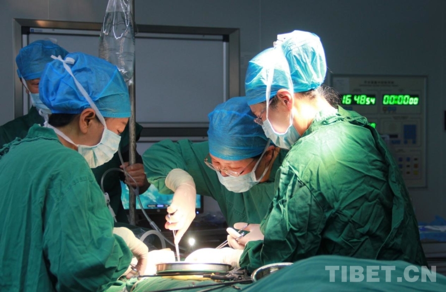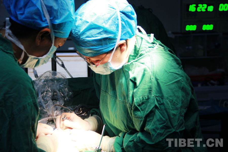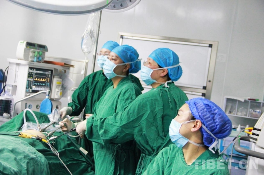 圖為航空總醫(yī)院婦科主任余立群(右二)在手術(shù)中指導甘孜縣人民醫(yī)院醫(yī)生操作手術(shù) 攝影:劉莉