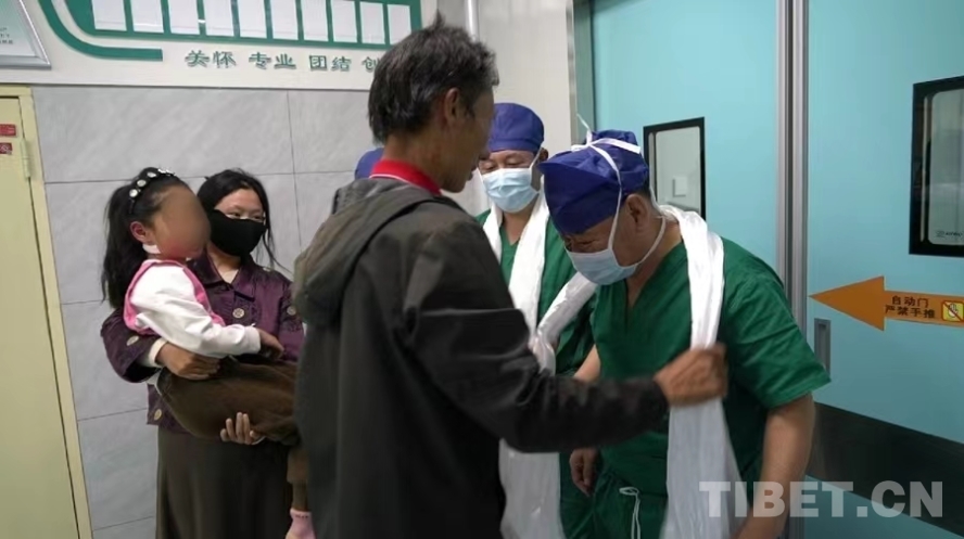 圖為7月10日,手術(shù)成功后,患兒家長(zhǎng)為醫(yī)療專家獻(xiàn)上哈達(dá)表達(dá)感謝 攝影:周晴晴