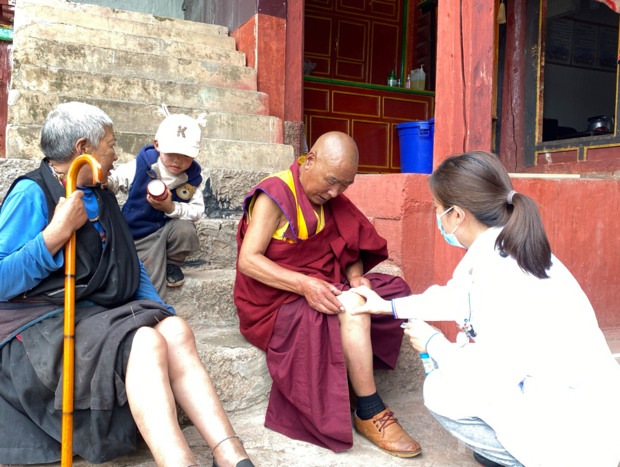 經(jīng)過與藏族群眾一天的密切交流,北京大學(xué)人民醫(yī)院骨關(guān)節(jié)科學(xué)科助理,骨關(guān)節(jié)科黨支部書記、主任醫(yī)師李虎,已經(jīng)從本地志愿者那里學(xué)會(huì)了簡單地用藏語表達(dá)“疼不疼”“不疼吧”,來為當(dāng)?shù)氐娜罕娺M(jìn)行更加精準(zhǔn)的、直接的診斷。