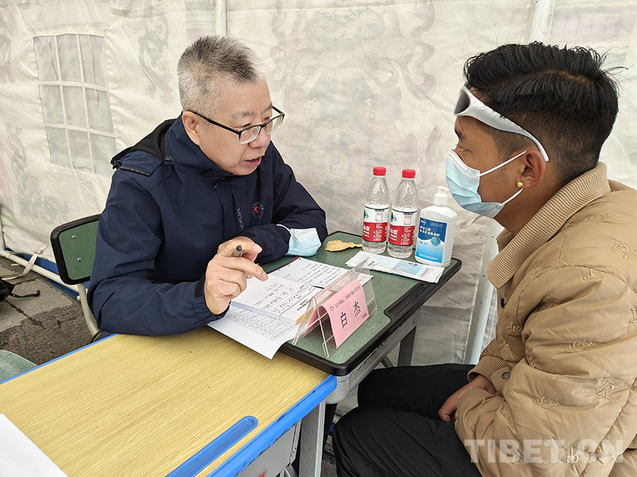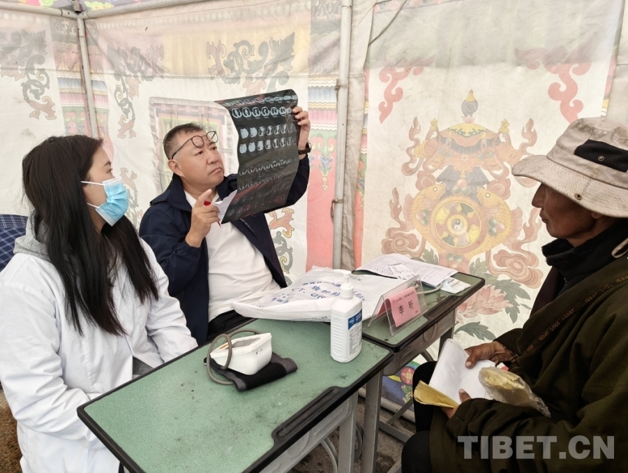 圖為中醫(yī)科副主任醫(yī)師白杰在塔公鎮(zhèn)為當(dāng)?shù)鼐用窳x診 供圖:北京同心共鑄公益基金會(huì)