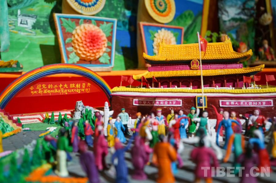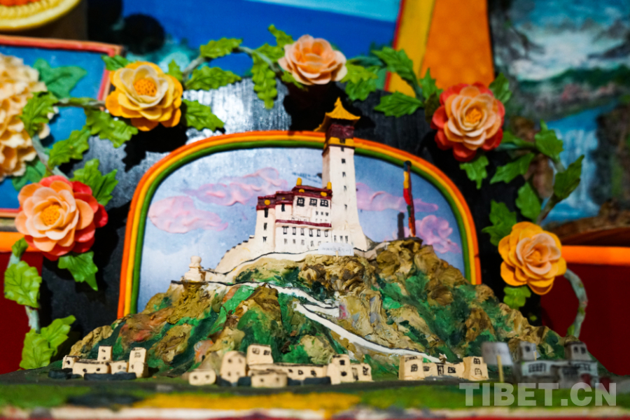 瓊科寺酥油花2018年被列入西藏自治區(qū)第五批自治區(qū)級非物質文化遺產代表性項目?!斑@個展廳里最大的一幅作品,是我們寺院內20多名僧人花10天時間制作完成的。我們寺院每年都會有符合時代旋律的新時代題材作品創(chuàng)作產生,我希望通過我們一年一年、一點一滴的努力,能夠終有一日將酥油花申報為國家級非物質文化遺產代表性項目?!杯偪扑滤钟突ǚ沁z傳承人阿旺西尼說。