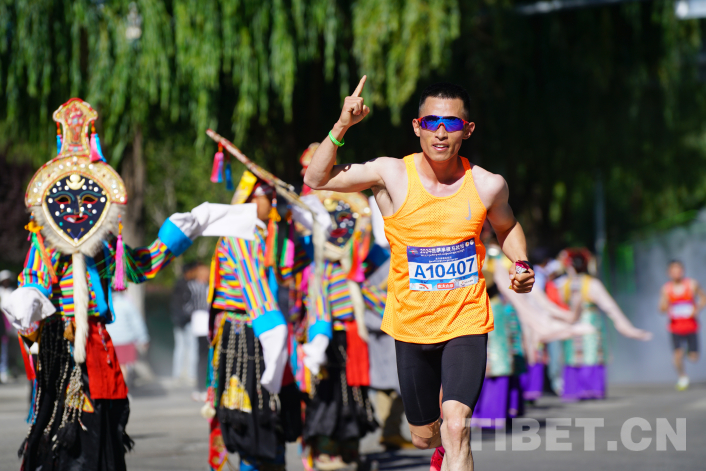 圖為 2024拉薩半程馬拉松18公里處參賽選手途經(jīng)拉魯濕地國家級自然保護區(qū),拉薩市城關區(qū)藏戲藝術團以藏戲的形式為選手加油助威 攝影:趙振宇