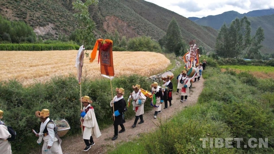 當(dāng)天清晨,村民們一大早身穿華麗的藏裝,頭戴“次仁金果”、高舉幡旗、身背經(jīng)書、手持青稞麥穗等作物,分成兩隊(duì)從村口出發(fā),轉(zhuǎn)村里的每一塊農(nóng)田進(jìn)行“收斂地氣、祈求豐收”的巡游活動。浩浩蕩蕩的隊(duì)伍傾村而出,大家以不同的口號與詠唱,祈求風(fēng)調(diào)雨順,國泰民安。