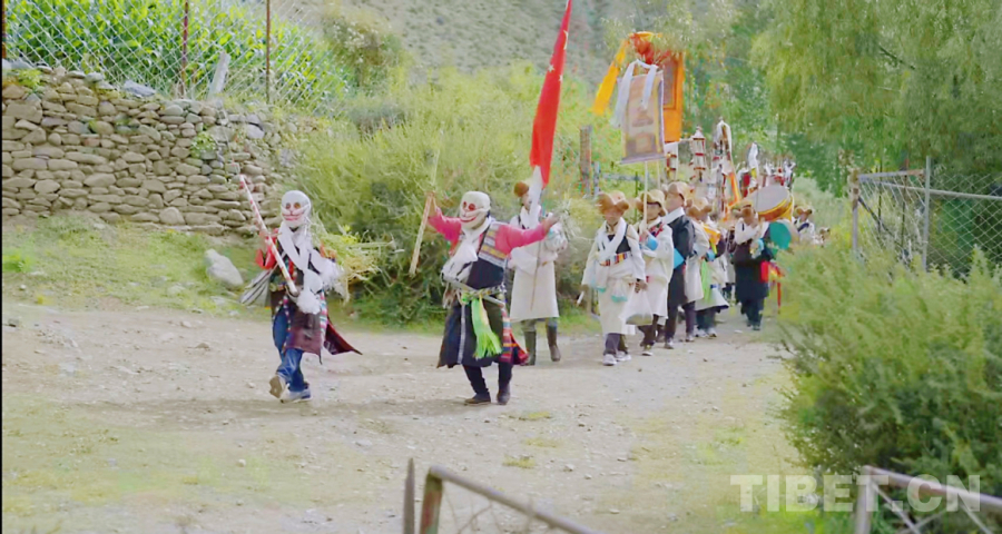 在望果節(jié)這一天,村里會選四位村民扮演成“土鍋杰日”,他們戴著面具,身穿“土鍋杰日”獨(dú)有的服飾走進(jìn)每家每戶表演“羌姆”舞祈求平安順?biāo)?、來年豐收。這個特別的儀式蘊(yùn)含著勞動人民勤勞智慧、團(tuán)結(jié)互助、尊重自然的價值理念。