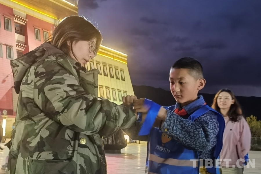 夜幕降臨,研學游團隊來到文成公主劇場。穿上藍馬甲,孩子們搖身一變成了文明旅游的小小宣傳員。帕里鎮(zhèn)小學注重培養(yǎng)學生的生態(tài)文明意識,自2023年7月起,主動加入“美麗公約”志愿組織的“擦亮天路行動”。學生定期在帕里鎮(zhèn)清理垃圾,也會為沿國道562來到帕里的游客宣傳垃圾隨身走的文明旅游理念。今天,來到拉薩,孩子們再次熟練地向劇場周圍的觀眾宣傳起來,一邊為大家在右臂系上代表文明旅游承諾的藍絲帶,一邊鼓勵“一起守護第三極,因為有你,中國更美”。一時間,文成公主劇場周圍成為了藍絲帶的海洋。