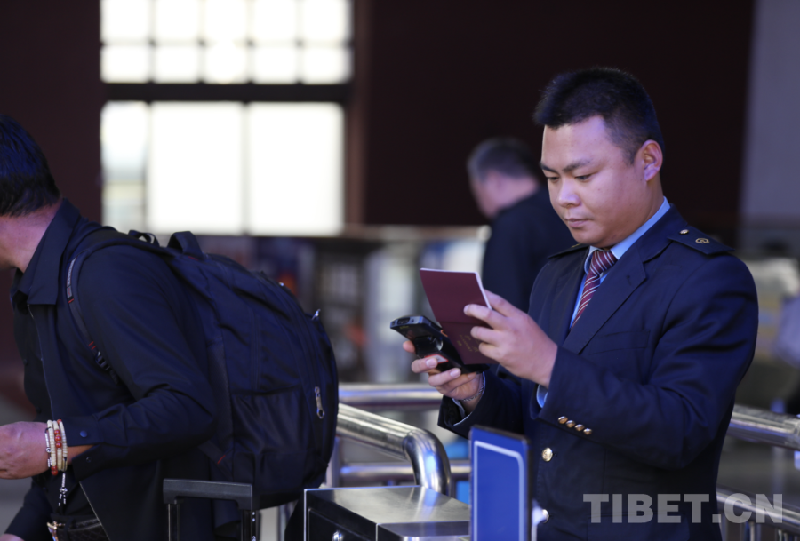 圖為拉薩火車(chē)站青年職工趙晨正在核驗(yàn)旅客證件 攝影:格桑央金