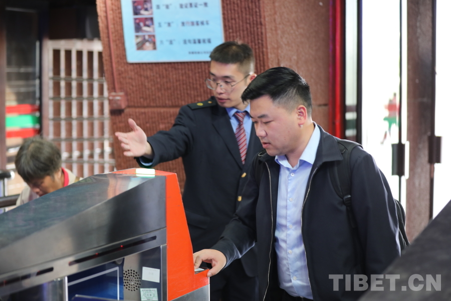 圖為拉薩火車(chē)站青年職工于志成正在進(jìn)站口協(xié)助旅客進(jìn)站 攝影:格桑央金