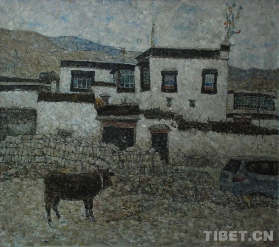 圖為“藍(lán)天白云——雪域高原油畫(huà)作品巡展”作品《村寨新景》(120x140cm 布面油畫(huà))作者:格桑次仁