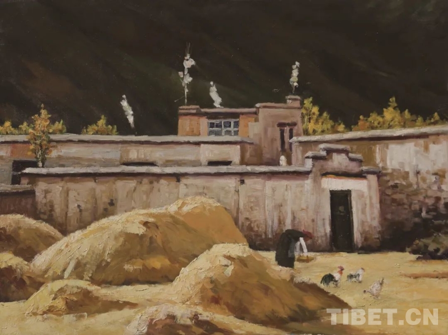 圖為“藍(lán)天白云——雪域高原油畫(huà)作品巡展”作品《金秋農(nóng)舍》(60x80cm 布面油畫(huà))作者:丹增朗杰