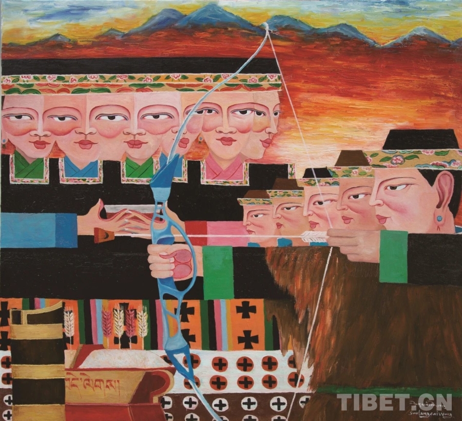 圖為“藍(lán)天白云——雪域高原油畫(huà)作品巡展”作品《工布響箭》(100x110cm 布面油畫(huà))作者:索朗才旺