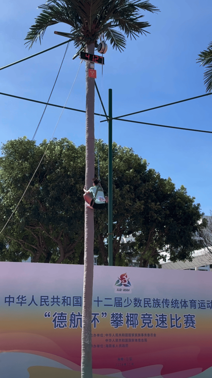攀椰競速設(shè)立男子攀椰9米競速和女子攀椰7米競速兩個(gè)項(xiàng)目,比賽要求運(yùn)動員使用統(tǒng)一提供的攀椰運(yùn)動用具,徒手攀爬至椰樹頂部并按下計(jì)時(shí)器,用時(shí)短者獲勝。