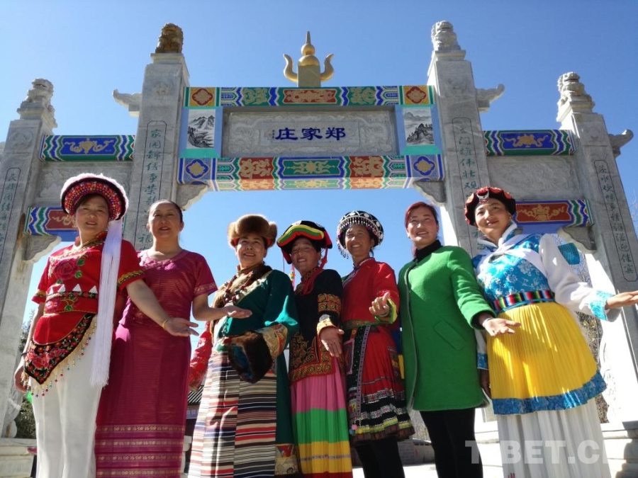 圖為鄭家莊村民身著民族服裝在村口合影 供圖:鄭家莊村民小組