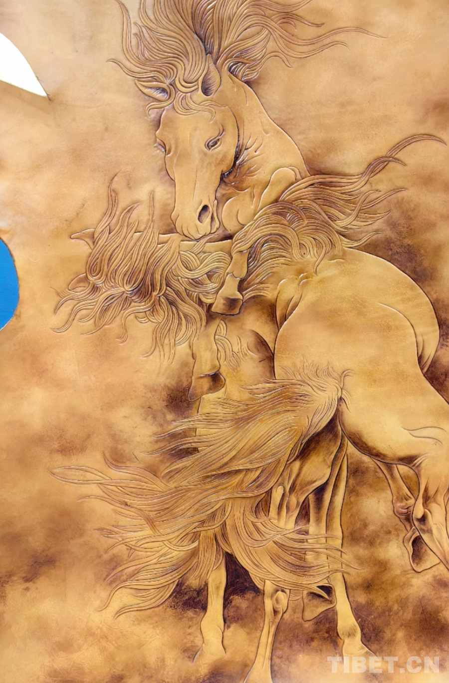 圖為多縣長江一號(hào)牧場(chǎng)參展的牛皮雕刻畫《青海雙驄》