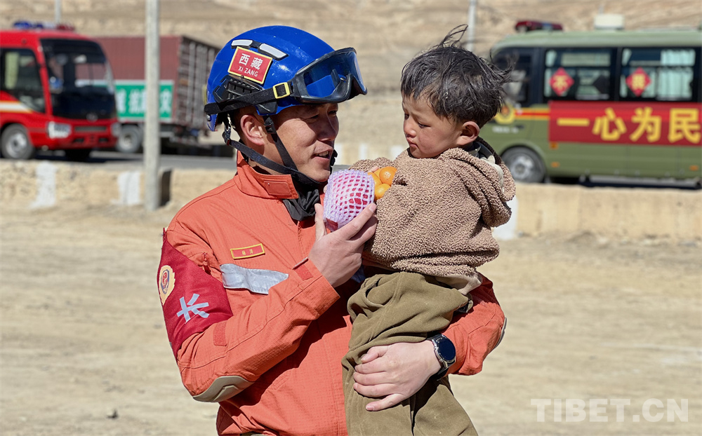 圖為救援人員為災(zāi)區(qū)小朋友拿水果