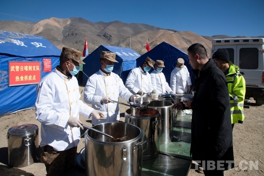 圖為武警日喀則支隊(duì)官兵正在向受災(zāi)群眾供應(yīng)熱食 攝影:趙振宇