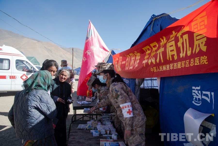 圖為中國(guó)人民解放軍西藏軍區(qū)總醫(yī)院醫(yī)務(wù)人員正在森嘎村向受災(zāi)群眾提供醫(yī)療服務(wù) 攝影:趙振宇