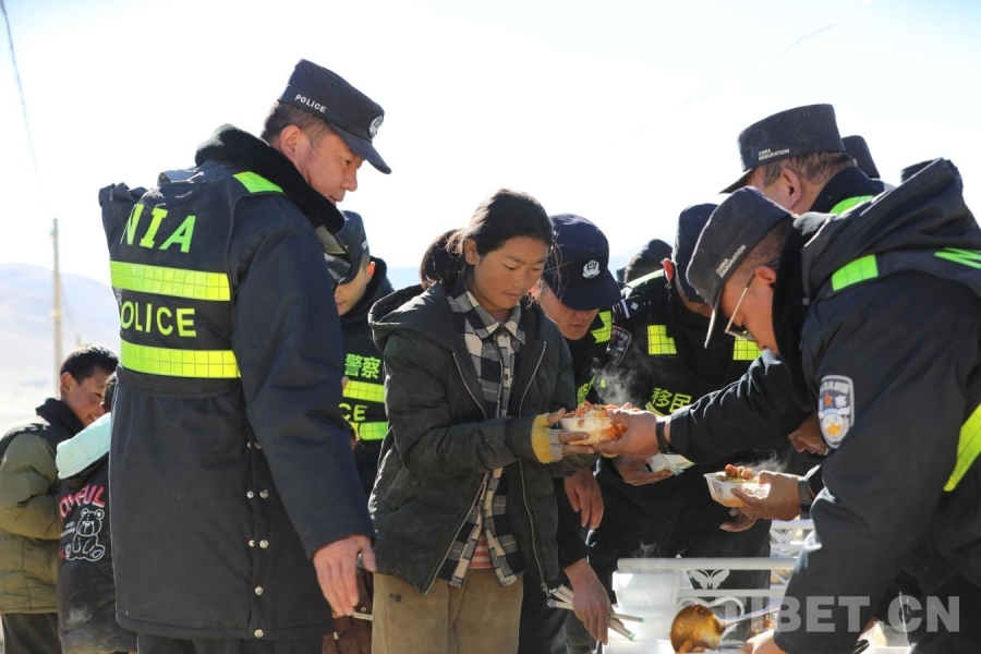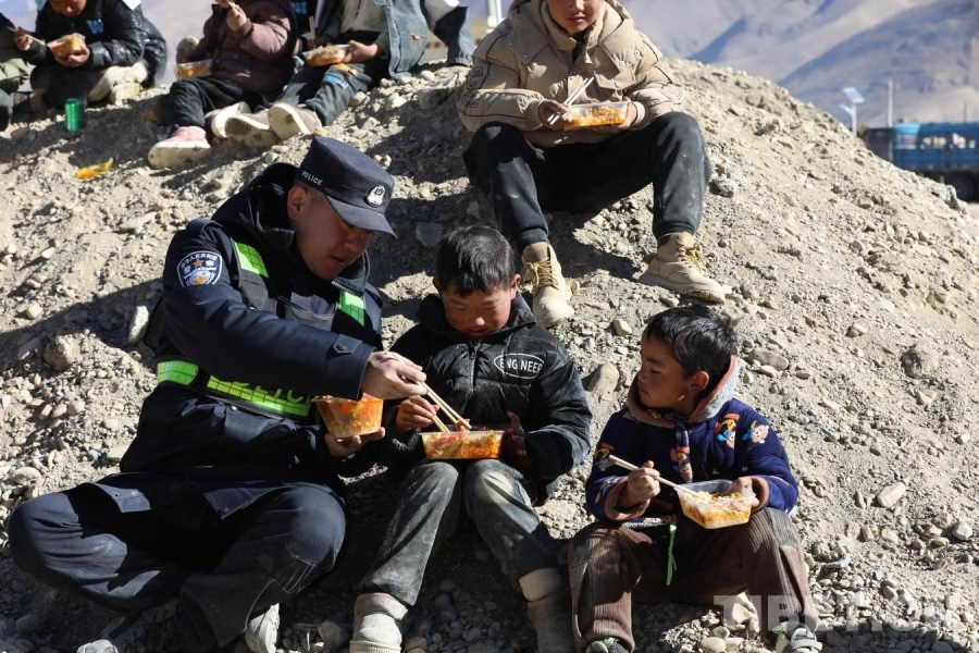 圖為在日喀則市定日縣長所鄉(xiāng)雜村安置點,移民管理警察為小朋友和群眾提供午餐 攝影:郭遠敬