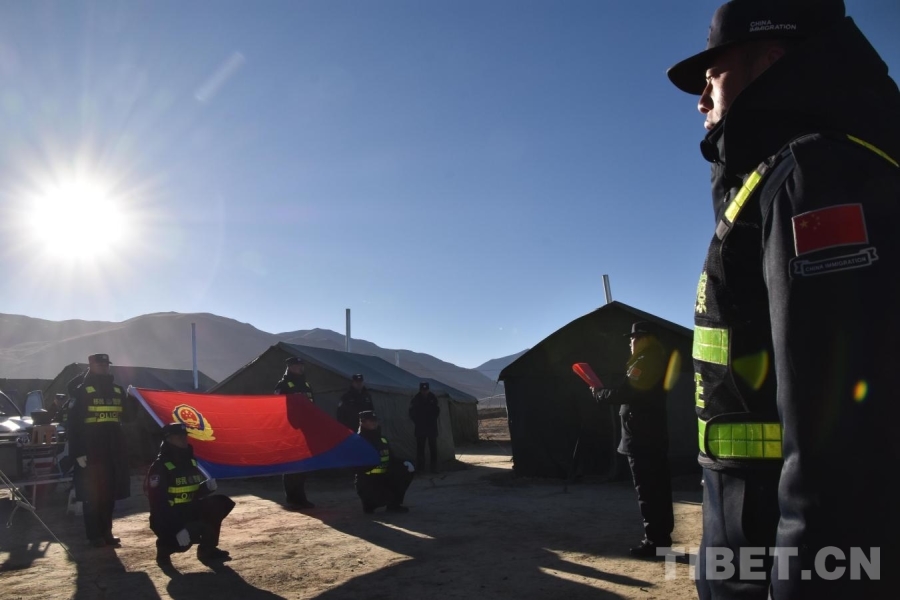 “我是中國人民警察,我宣誓……” 上午10點20分,隨著激昂的宣誓聲響起,日喀則邊境管理支隊的領導帶領參與救援的民警面向警旗,重溫入警誓詞,整個儀式在莊嚴的中國人民警察警歌中結束。宣誓儀式結束后,安置點的小朋友們?yōu)閰⑴c救援的民警獻上了潔白的哈達,敬禮致敬。這一刻,警民之間的情感紐帶在莊重的氛圍中進一步拉近。